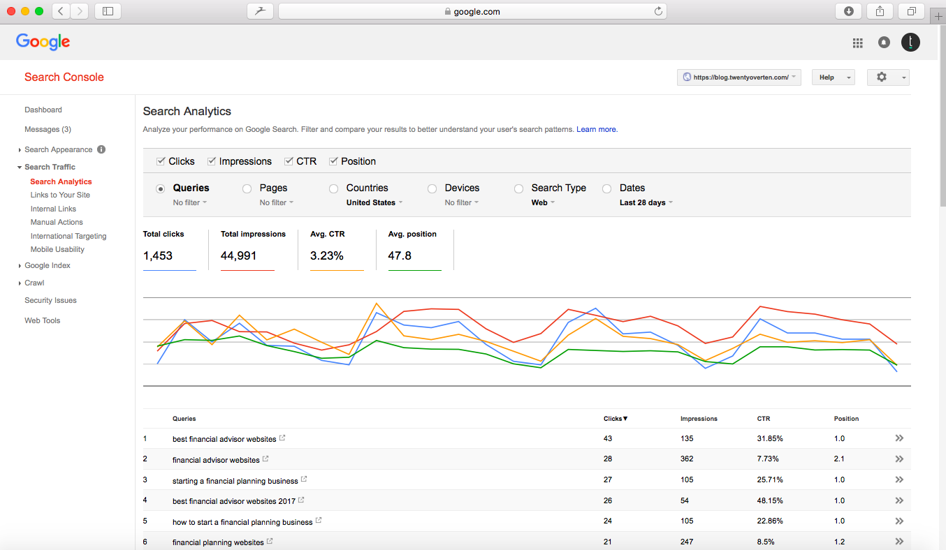Das Bild unten für den Twenty Over Ten-Blog zeigt uns, dass wir derzeit auf Platz 1 für die Keyword-Abfrage „Beste Finanzberater-Websites“ stehen.