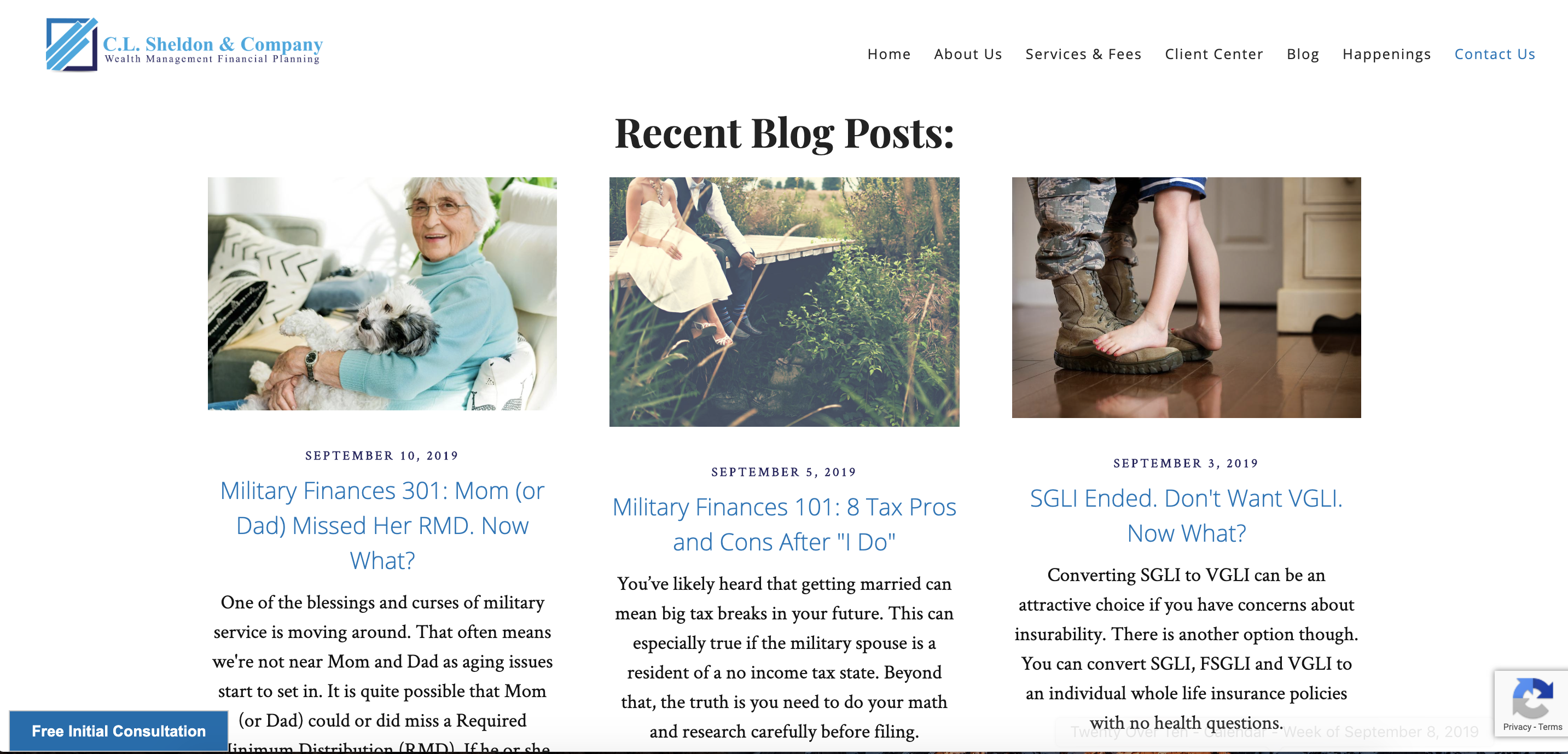 Der Kunde von Twenty Over Ten, CL Sheldon & Company, führt einen aktualisierten Blog-Bereich, der sich auf seine Nische der Vermögensverwaltung für das Militär bezieht. Es ist wichtig, dass Ihr Blog Ihre Nische mit hilfreichen und relevanten Informationen versorgt. Denken Sie daran, dass Sie da sind, um ihnen zu dienen, also nutzen Sie Ihren Blog, um ihnen zu zeigen, wie Sie dies tun können.