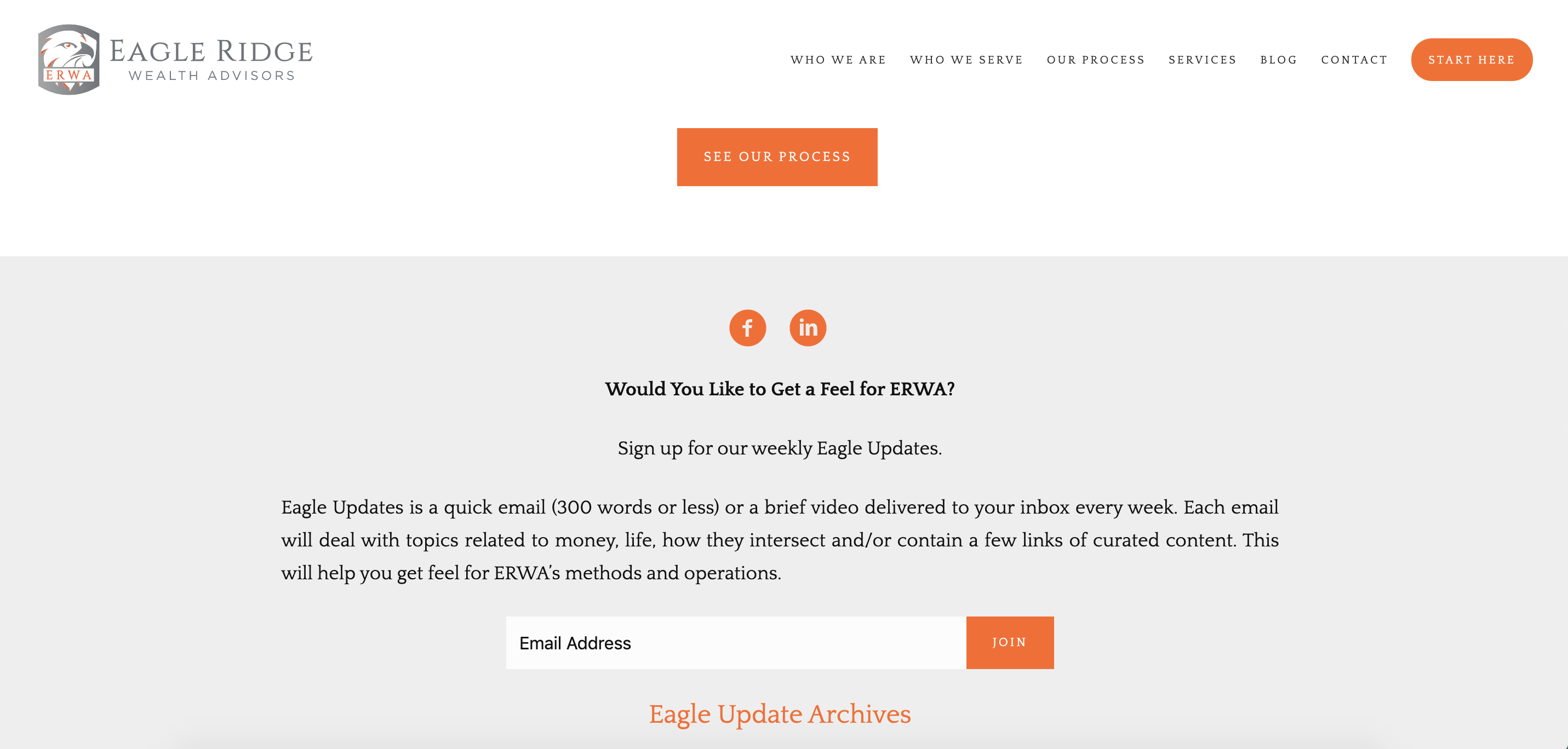 Im Beispiel unten hat der Twenty Over Ten-Kunde Eagle Ridge Wealth Advisors einen CTA am Ende seines Blogs, um die Leser zu ermutigen, sich für seinen Newsletter anzumelden.