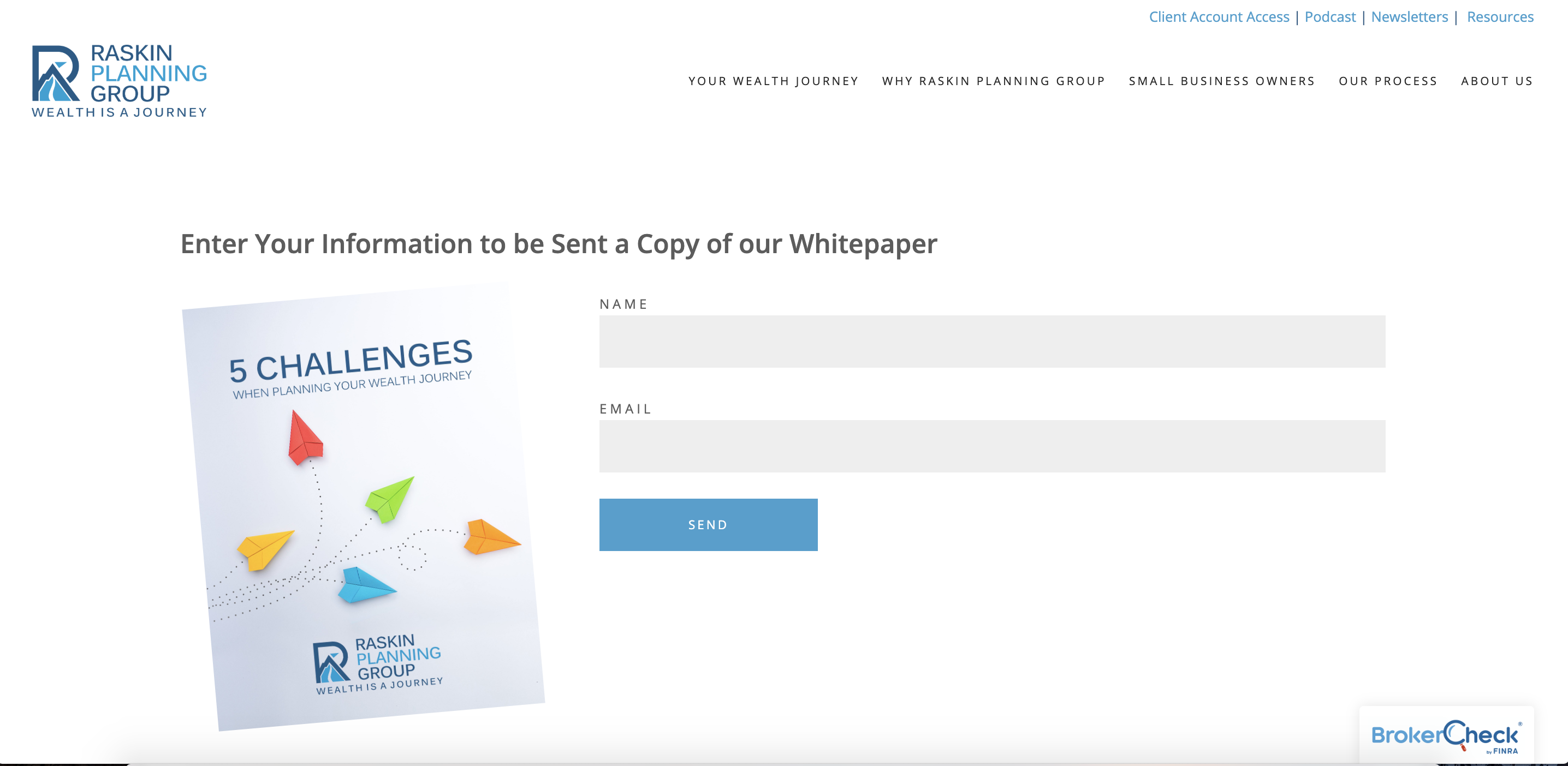 Im Beispiel unten bietet der Twenty Over Ten-Kunde Raskin Planning Group Besuchern der Website eine Kopie ihres Whitepapers im Austausch für ihre Kontaktinformationen an.
