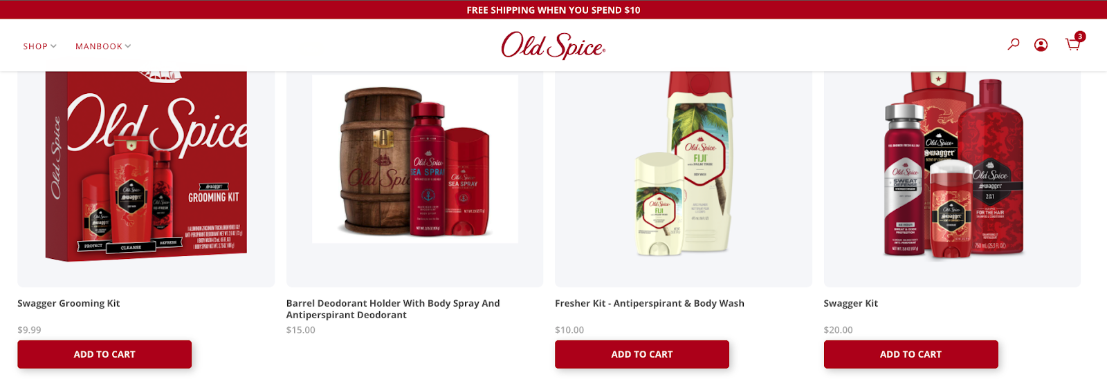Old Spice ist eine amerikanische Marke für Männerpflegeprodukte, die Aftershaves, Deodorants und Antitranspirantien, Shampoos, Duschgele und Seifen umfasst. Old Spice hat einen DTC-Speicher. Sie bieten kostenlosen Versand für Bestellungen über 10 $ und Produktpakete mit einem besseren Festpreis.
