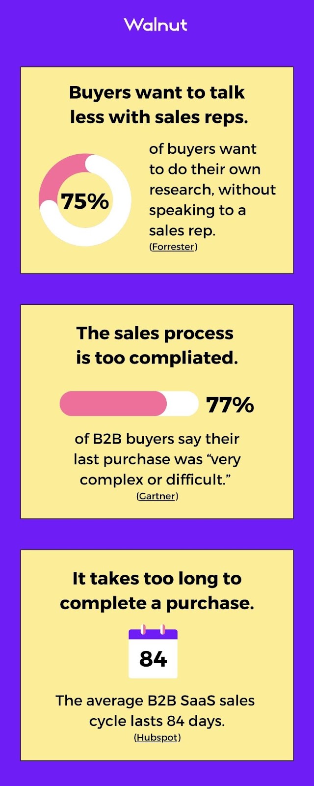 Walnut kann Ihnen nicht nur bessere Demos zur Verwendung in Ihrem B2B-Verkaufstrichter zur Verfügung stellen, sondern führt auch den Kampf zur Optimierung des ansonsten schmerzhaften B2B-Kaufprozesses an.