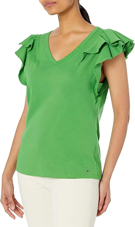 Ein elegantes T-Shirt ist ein tolles Basic für sommerliche Arbeitsoutfits. Dieses Modell von Tommy Hilfiger hat hübsche Flatterärmel und ist in 4 Farben erhältlich.