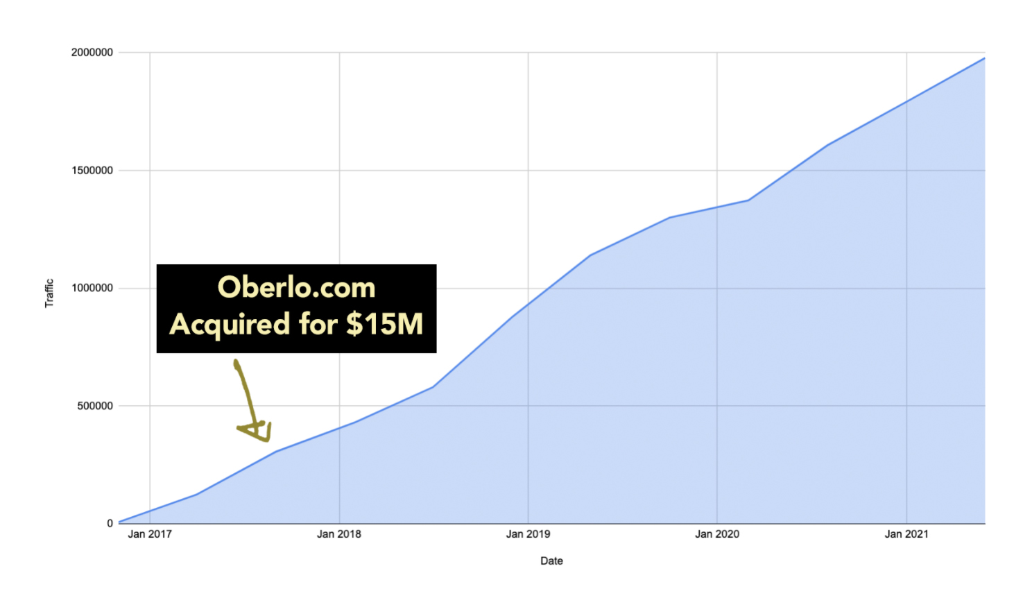 Unsere Daten sagen voraus, dass Oberlo bis März 2021 über 2 Millionen Besuche pro Monat generieren wird. Das sind 24 Millionen organische Besucher pro Jahr und beinhalten nicht den Verkehr, der von bezahlten Medien, Website-Empfehlungen oder sozialen Medien kommt.