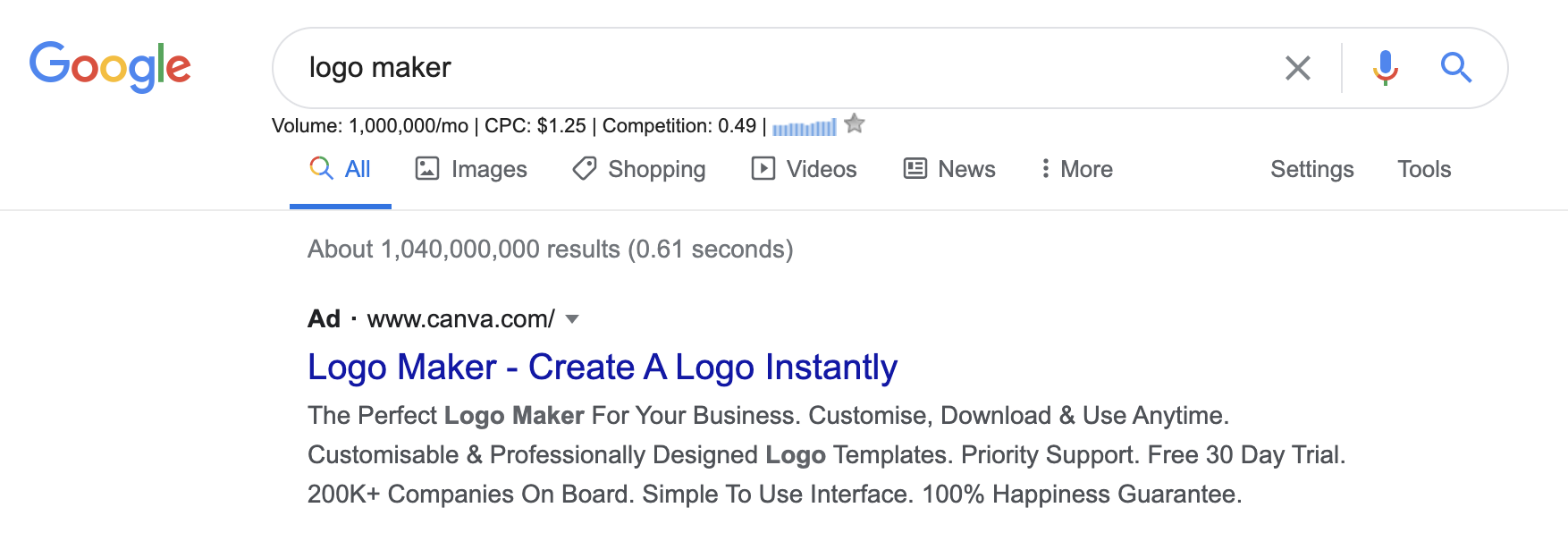Während Marken wie Canva mehr als einen Dollar pro Klick ausgeben, um Menschen zu gewinnen, die ein Logo erstellen möchten (und schließlich für ihr Logo-Maker-Produkt bezahlen):