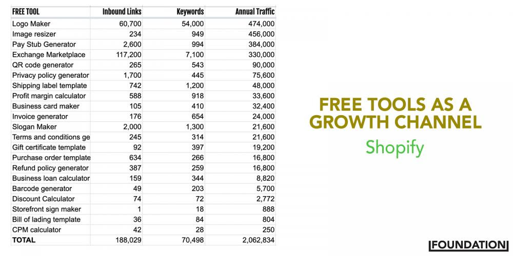 Dies ist nicht einmal das beste Tool, das Shopify in seinem Content-Portfolio hat. Hier ist eine Momentaufnahme einiger der verschiedenen Tools, die Shopify im Laufe der Jahre eingeführt hat, sowie einiger wichtiger Kennzahlen: