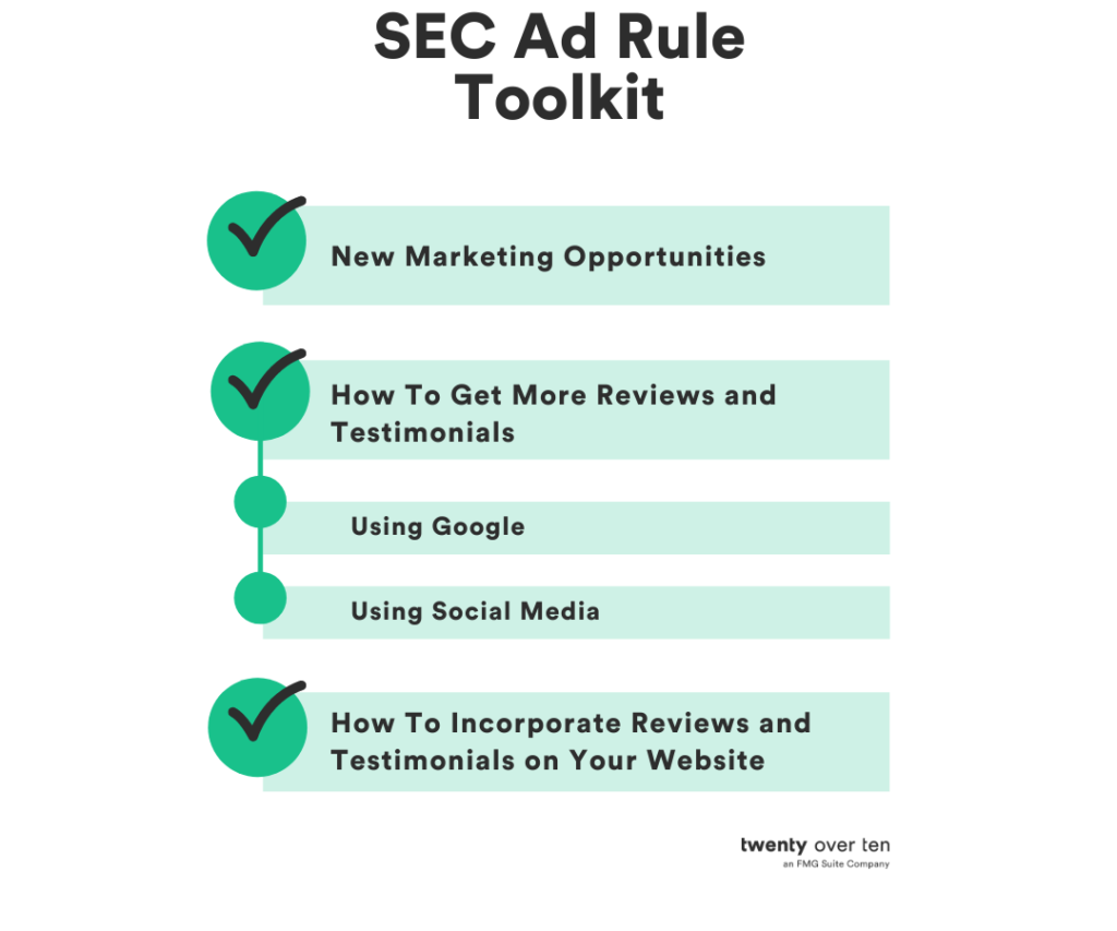 Die neue Werbevorschrift der SEC hat viele neue Marketingmöglichkeiten für Berater geschaffen. Die folgenden Ressourcen helfen Ihnen bei der Navigation durch diese Möglichkeiten, damit Sie schnell entscheiden können, welche Optionen für Ihr Unternehmen am besten geeignet sind.