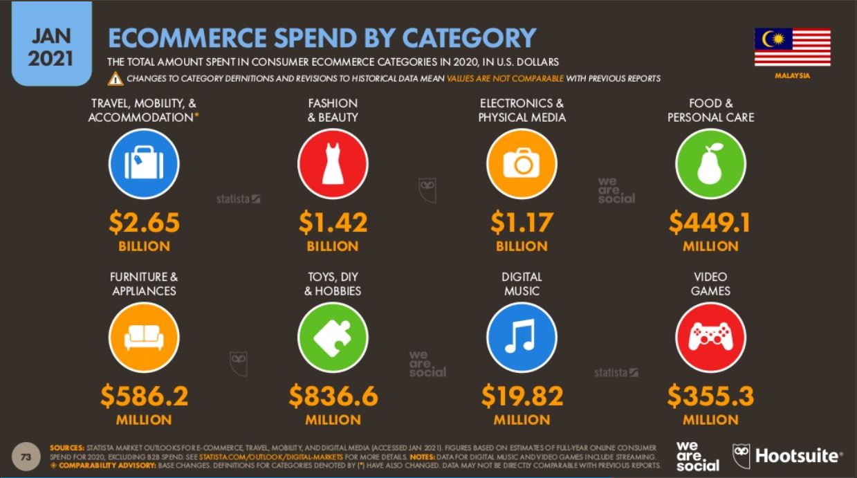Laut Hootsuit und We Are Social on Data Reportal ist „Elektronik und physische Medien“ mit 1,17 Milliarden US-Dollar nach „Reisen, Mobilität und Unterkunft“ sowie „Mode und Schönheit“ die am dritthäufigsten gekaufte Produktkategorie in Malaysias E-Commerce-Ausgaben. Statista prognostiziert, dass der Marktumsatz im Jahr 2021 1,131 Millionen US-Dollar erreichen wird.