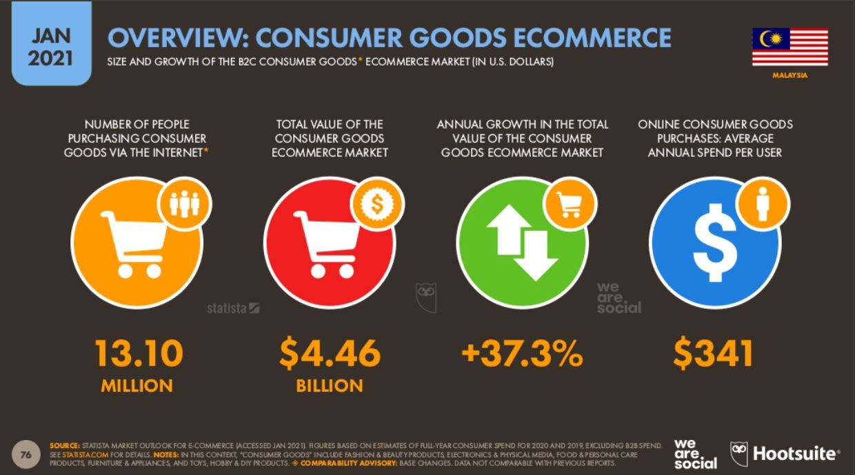 Die Penetrationsraten von Mobiltelefonen und Internet schießen in die Höhe, da immer mehr Malaysier online einkaufen. Die Penetrationsrate wird auch durch die Auswirkungen von Malaysias Movement Control Order (MCO) vorangetrieben, einer Sicherheitsmaßnahme zur Eindämmung der Ausbreitung des COVID-19-Virus im Jahr 2020. Malaysier im ganzen Land blieben während der Sperrung zu Hause und mussten ihre täglichen Lebensmittel kaufen Essentials und Lebensmittel von E-Commerce-Plattformen und Websites.