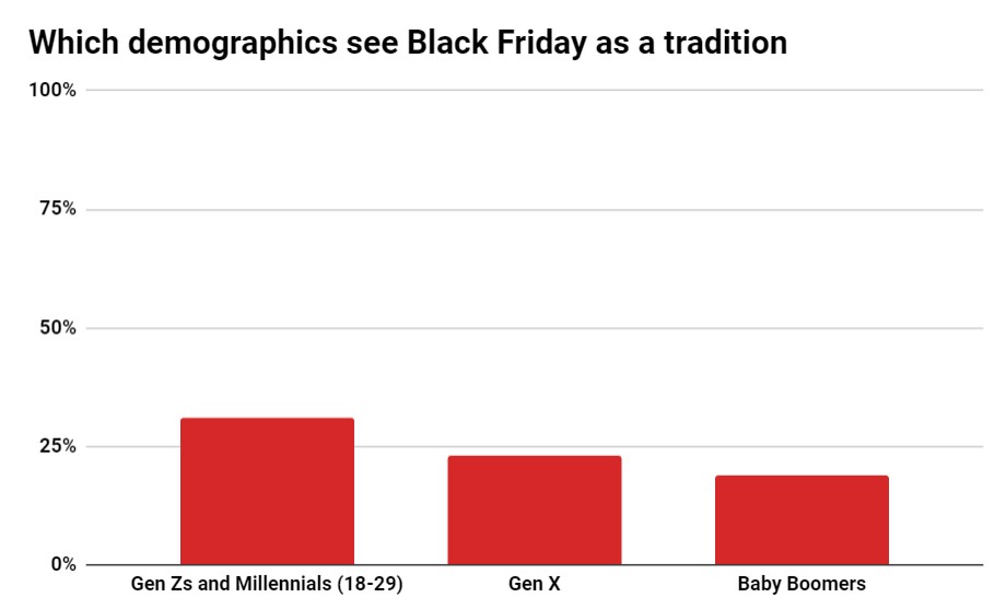 Die Feiertagsstudie von Bazaarvoice ergab, dass jüngere Käufer nicht nur nach Rabatten suchen, sondern auch am Black Friday und an anderen Aktionstagen einkaufen gehen, weil es eine Tradition ist, mit ihren Familien und Freunden einzukaufen. Bei den Käufern im Alter von 18 bis 29 Jahren nannte fast ein Drittel (31 %) das Einkaufen an Ausverkaufstagen eine Familientradition – Statistiken, die auf 23 % bzw. 19 % für die Generation X und die Babyboomer fallen.