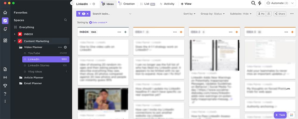 Das Beste an ClickUp ist, dass ich damit meinen gesamten Inhaltsproduktionsprozess abbilden kann, von Inhaltsclustern über Videoideen bis hin zum Filmen, Bearbeiten und Bewerben jedes Videos.