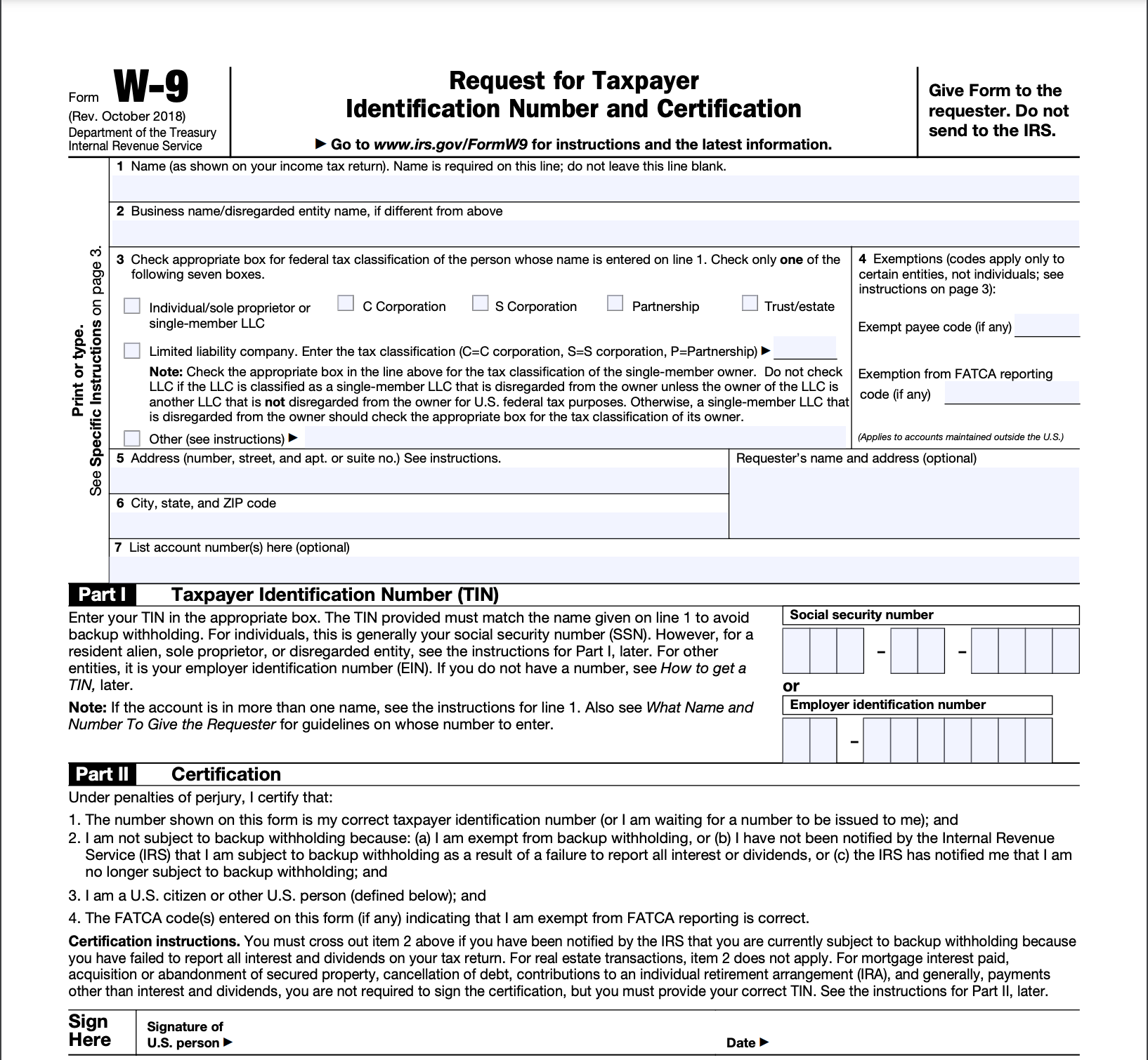 - 有限責任会社。 LLCは、受け取った収入を報告するために、所有者のためにW9フォームに記入する必要があります。 これにより、適切な税金が確実に支払われます。