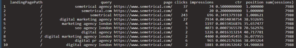 ga_landingPages <- data %>% group_by(landingPagePath) %>% summarise(sum(sessions)) sc_data$landingPagePath <- gsub("https://www.semetrical.com","",sc_data$page) merged_data <- merge(sc_data, ga_landingPages, by = 'landingPagePath')