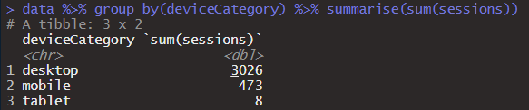 data %>% group_by(deviceCategory) %>% summarise(sum(sessions))