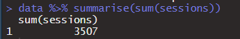 Con el paquete dplyr puede manipular fácilmente muchos datos. La función de suma le permite encontrar el total de una métrica específica dentro de su conjunto de datos. Suponga que está viendo sesiones diarias y desea encontrar el número total de sesiones en el conjunto de datos.