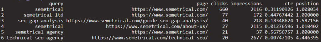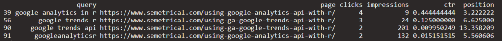 sc_data <- search_analytics("https://www.semetrical.com", "2021-01-01", "2021-12-31", c("query", "page"), dimensionFilterExp = c("device==DESKTOP","country==GBR"), searchType="web", rowLimit = 100)
