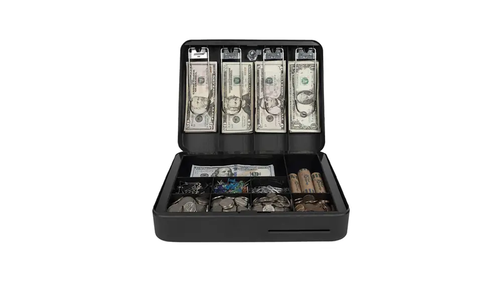 - Múltiples compartimentos para monedas, billetes y otros suministros.