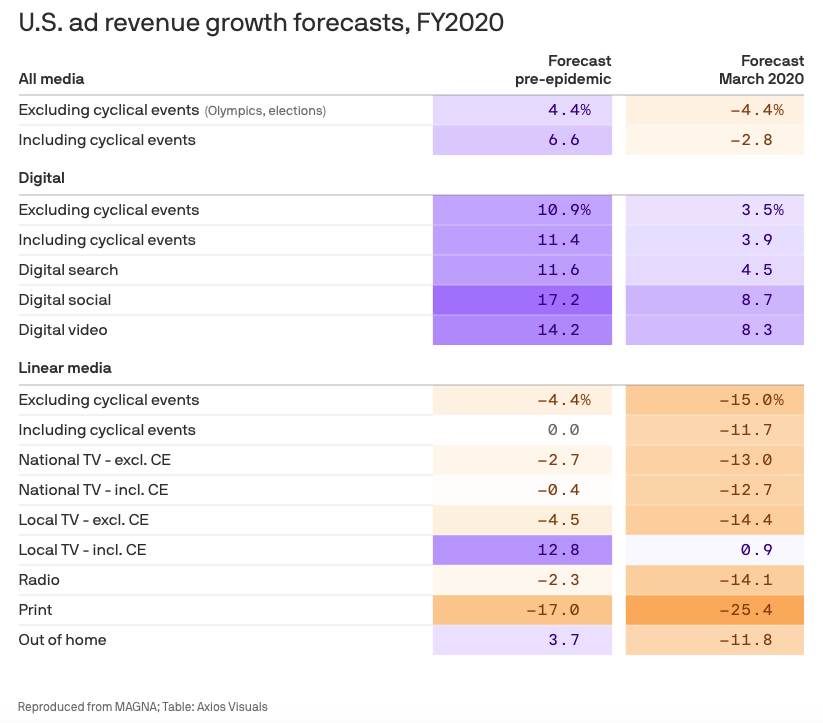 El impacto posterior de esta recesión económica, que de hecho perjudica prácticamente a todas las industrias, incluye a los anunciantes. A medida que se produce la falta de consumo, las empresas reducen la inversión en publicidad, lo que a su vez perjudica a las empresas publicitarias (y, en última instancia, a sus empleados). Axios destaca el impacto del coronavirus en el espacio publicitario.