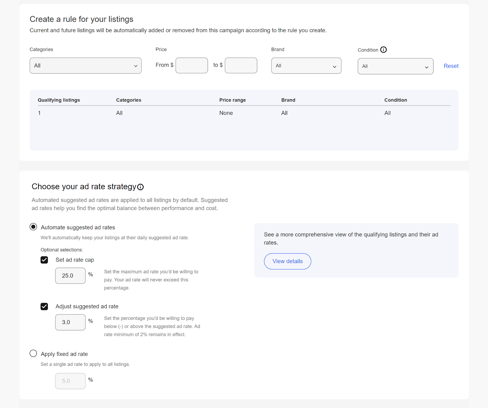 Panel de publicidad: si crea una campaña estándar con Panel de publicidad, usará filtros para incluir listados que coincidan con categorías de eBay, precios específicos, marca y condición. Luego, establece las tarifas que estás dispuesto a pagar por cada venta.