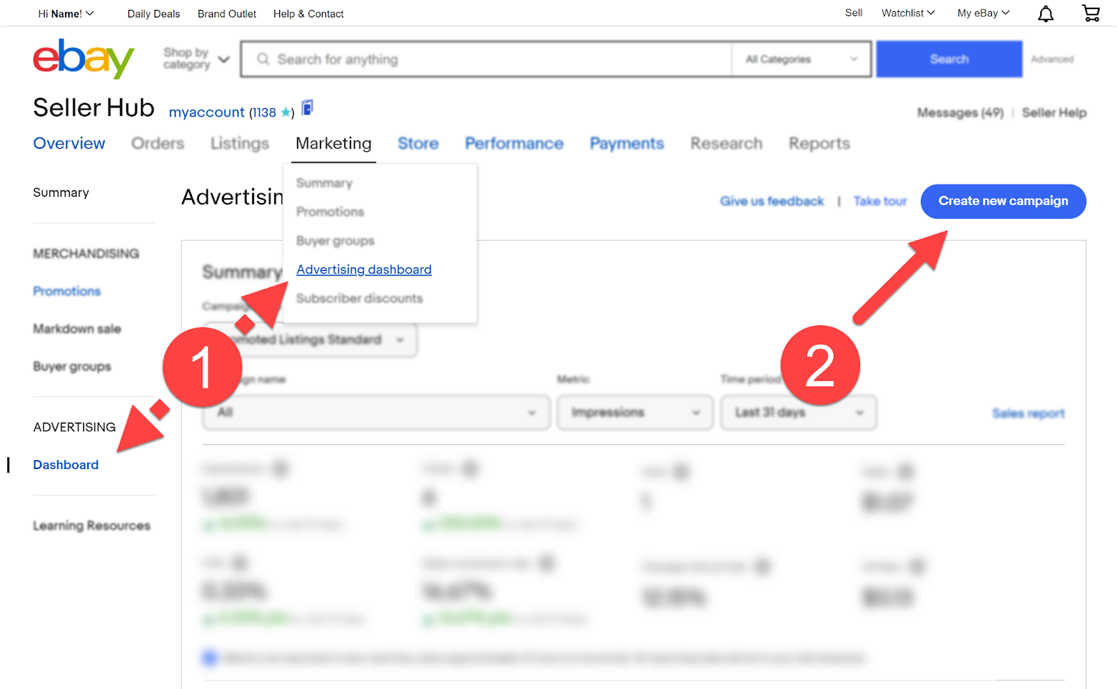 Primero, visite el Centro de vendedores de eBay. Luego, navegue por la pestaña Marketing hasta el Panel de publicidad y haga clic en "Crear nueva campaña".