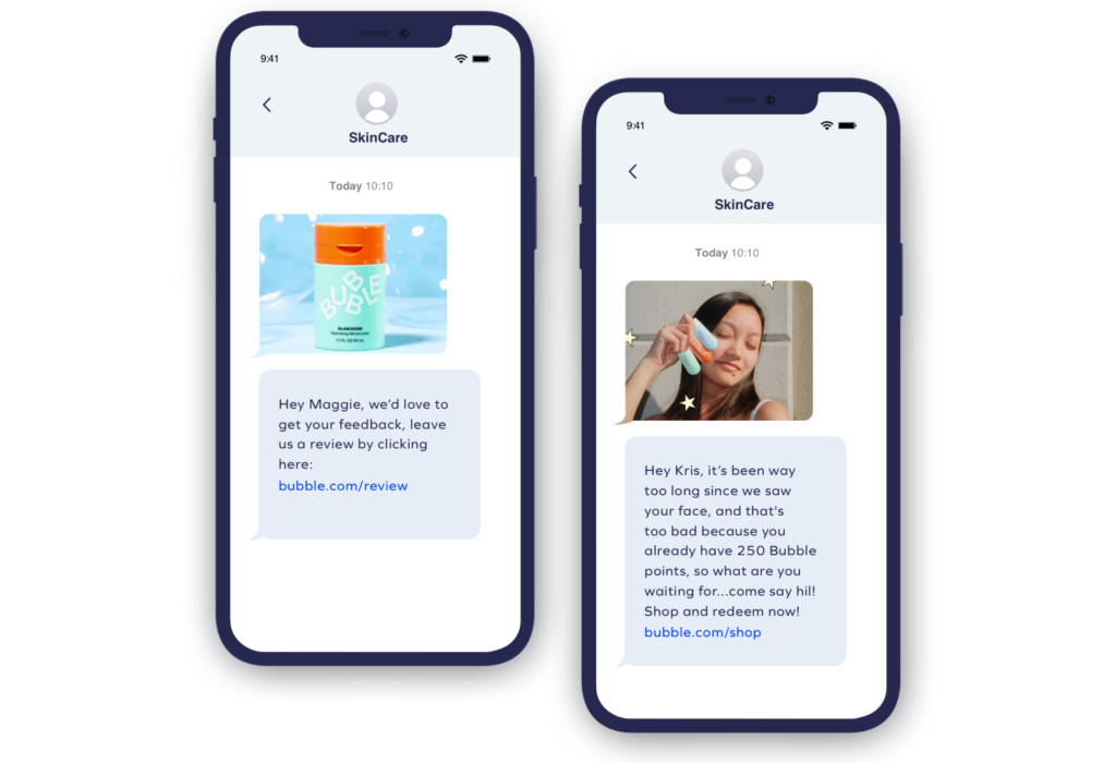 Bubble, una marca de cuidado de la piel de la nueva escuela, actúa sobre los datos de los miembros leales, como el comportamiento de compra y los motivadores, para catalizar la acción del cliente y el compromiso apasionado. Bubble envía mensajes de texto personalizados a los compradores objetivo que no han comprado en mucho tiempo, recordándoles a los clientes su saldo de puntos canjeables. Y animan a sus compradores más felices (miembros leales) a dejar reseñas detalladas sobre sus productos favoritos.