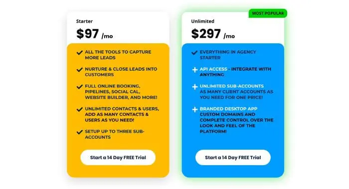 - Cuenta ilimitada de agencia : por $297 al mes , este plan le brinda acceso ilimitado a las funciones de GoHighLevel, adecuado para empresas que buscan escalar.