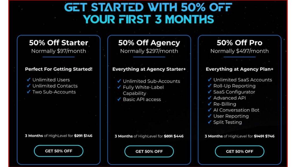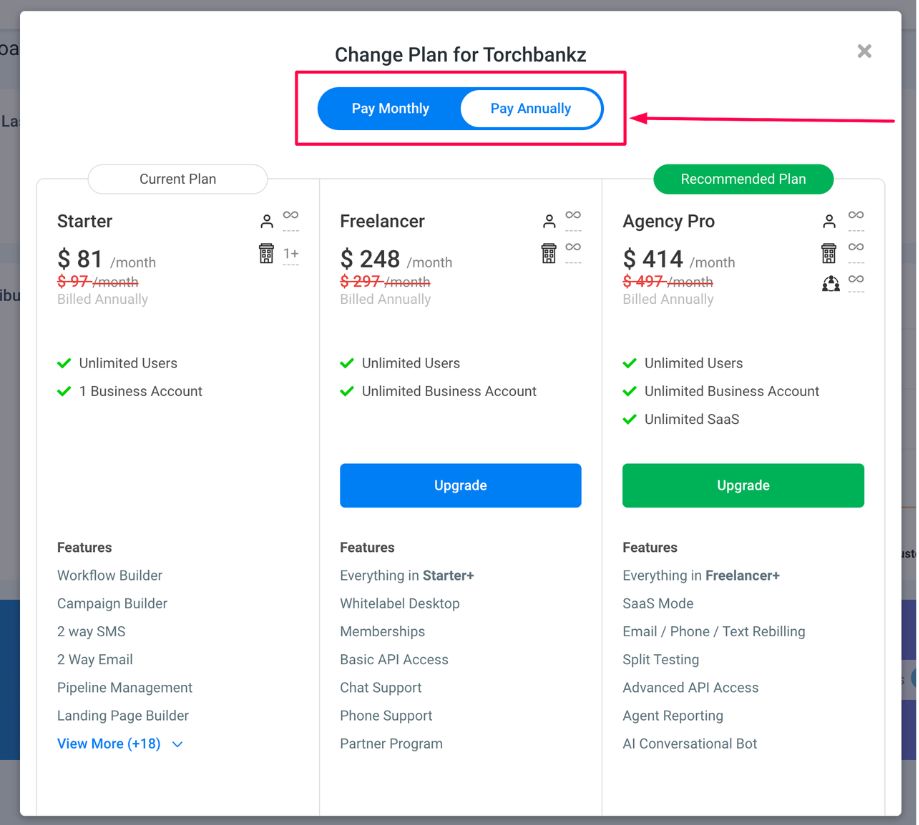 Dependiendo del plan de precios de GoHighLevel que desee, puede obtener varios descuentos, desde descuentos anuales hasta ofertas especiales como GoHighLevel BlackFriday y otras promociones.