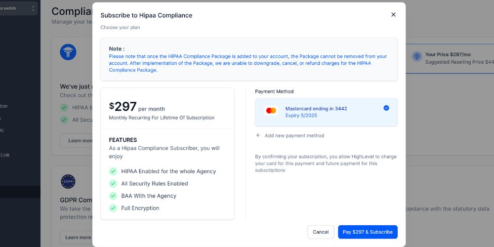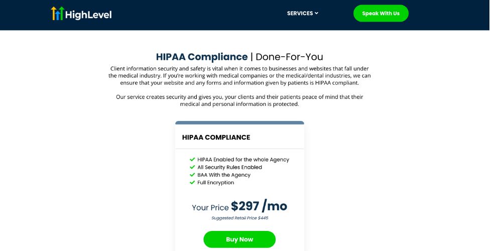 GoHighLevel reconoce la importancia de estas regulaciones y, por lo tanto, proporciona un complemento de cumplimiento de HIPAA.