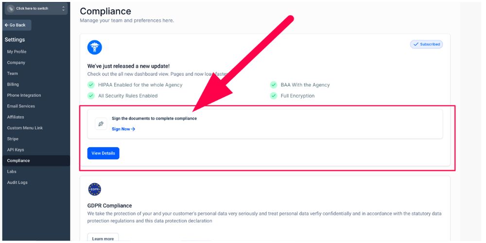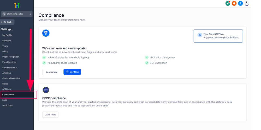 Para suscribirse, inicie sesión en su cuenta de agencia GoHighLevel y navegue hasta "Cumplimiento" en la parte inferior izquierda de su cuenta.