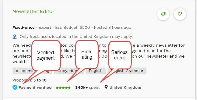 Cuando busque trabajos, le aconsejo que solo mire los que tienen el indicador de "pago verificado" de marca azul. Los estafadores intentarán obtener trabajo gratis de usted, y lo hacen al no tener un método de pago verificado en su cuenta.