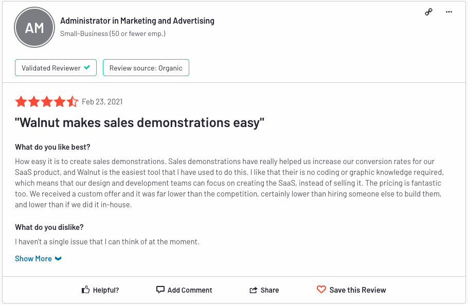 “El mayor problema que nos soluciona Walnut es reducir la necesidad de invertir el tiempo de los desarrolladores en demostraciones de ventas. El uso de Walnut liberó el 35 % de nuestra fuerza laboral de desarrollo, lo que nos permitió avanzar mucho más rápido”.