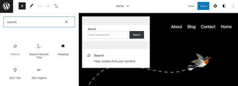 También puede ser útil incluir una barra de búsqueda. En el Editor del sitio de WordPress, puede agregar esta característica con un bloque de búsqueda: