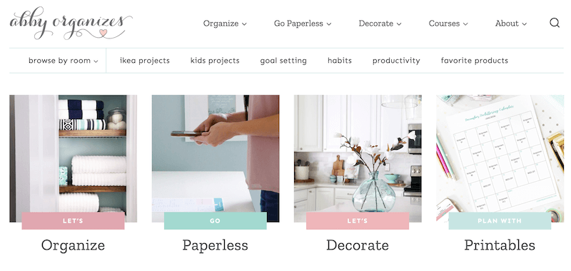 Por ejemplo, Abby Organizes es un sitio web afiliado que promueve la decoración del hogar y consejos de organización. Usando pasteles suaves y mucho espacio en blanco, el diseño web muestra perfectamente una marca consistente: