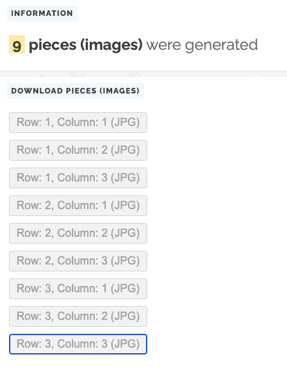 Ahora que su imagen está dividida, PineTools generará las partes de su imagen más grande etiquetadas por cada fila y columna.