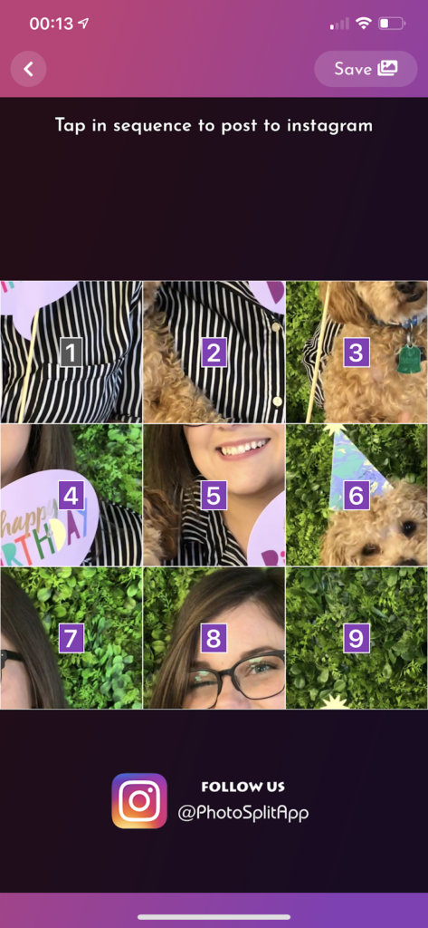 Obtenga una vista previa de sus nuevas imágenes divididas en la siguiente pantalla y guarde cada pieza o compártala en Instagram.