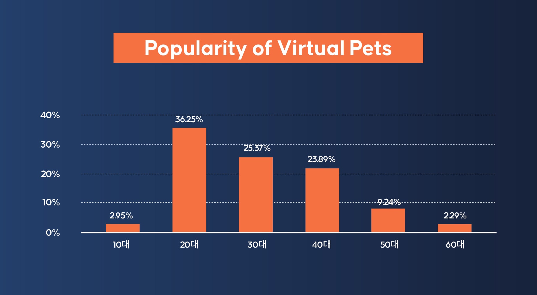La Generación MZ está impulsando el crecimiento de la industria del comercio virtual de mascotas. Según un estudio realizado por Mobile Index, que analizó datos de cuatro empresas de comercio de mascotas virtuales, el 62% de todos los usuarios tenían entre 20 y 30 años. El porcentaje de personas de 40 años fue del 23,9%, los de 50 años del 9,2% y los adolescentes del 3%. Los que tenían más de 60 años constituían apenas el 2%.