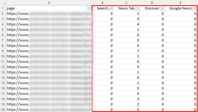 A continuación, exporté datos de rendimiento de forma masiva para las últimas tres mil URL. Una vez exportados, pude aislar URL con muy pocos o ningún dato de rendimiento en todas las superficies. Estos eran excelentes candidatos para posibles problemas de sindicación. es decir, si el contenido no produjo impresiones ni clics, entonces tal vez un socio de sindicación se clasificó frente a mi cliente.