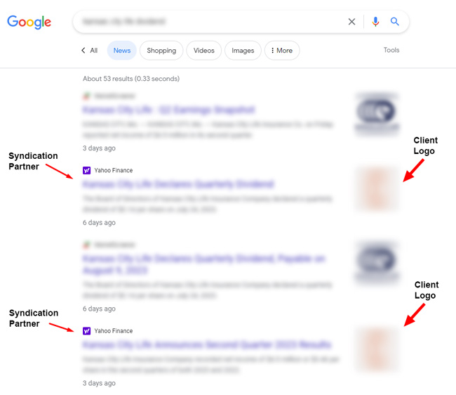 A continuación, Yahoo News se clasifica dos veces en la pestaña Noticias en la Búsqueda (que es una superficie importante para mi cliente), mientras que la fuente original no se encuentra por ninguna parte. Y el logotipo de mi cliente se muestra para el contenido sindicado. Que agradable…