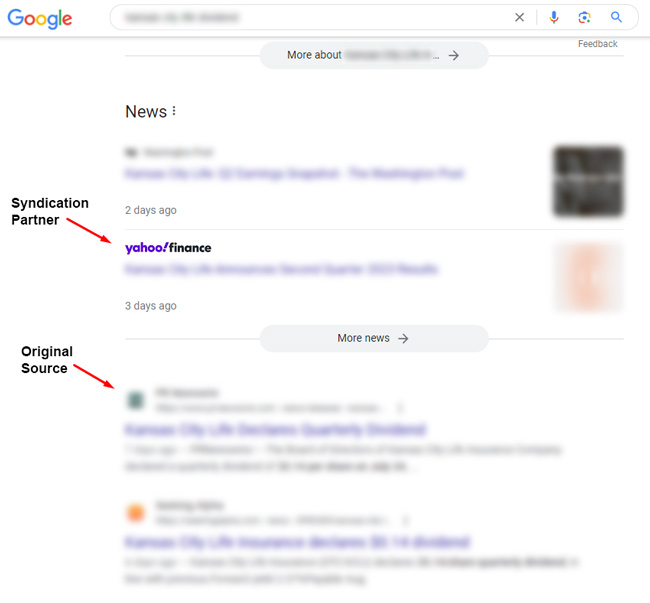 Proporcionaré un ejemplo rápido a continuación para que pueda ver el lío de sindicación. Tenga en cuenta que tuve que difuminar mucho las SERP en las siguientes capturas de pantalla, pero quería dar un ejemplo de lo que encontré. Una vez más, no había rima ni razón por la que esto sucedía. Según este ejemplo, y lo que vi en otros ejemplos que verifiqué, puedo entender por qué Google dice que no indexe las URL en sentido descendente en los socios de sindicación. Si no, cualquiera de esto podría pasar.