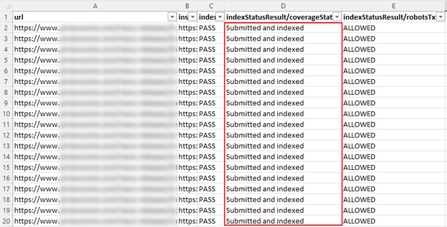 - Ejecute las URL a través de la API de inspección de URL para verificar la indexación en masa (para identificar cualquier tipo de problema de indexación, como que Google elija el socio de sindicación como la fuente canónica versus la fuente original). Si las páginas no estuvieran indexadas, entonces claramente no se clasificarían...