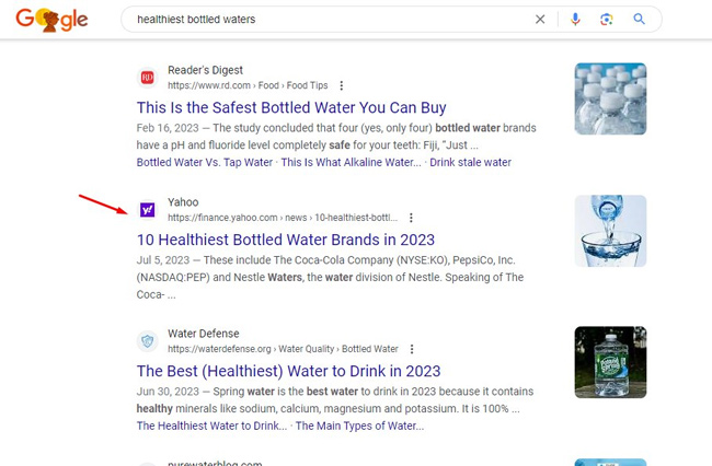 Y aquí está el puesto número 2 de Yahoo Finance para la palabra clave objetivo en los SERP principales. Por lo tanto, el socio de sindicación está clasificado por encima del original en los resultados de búsqueda: