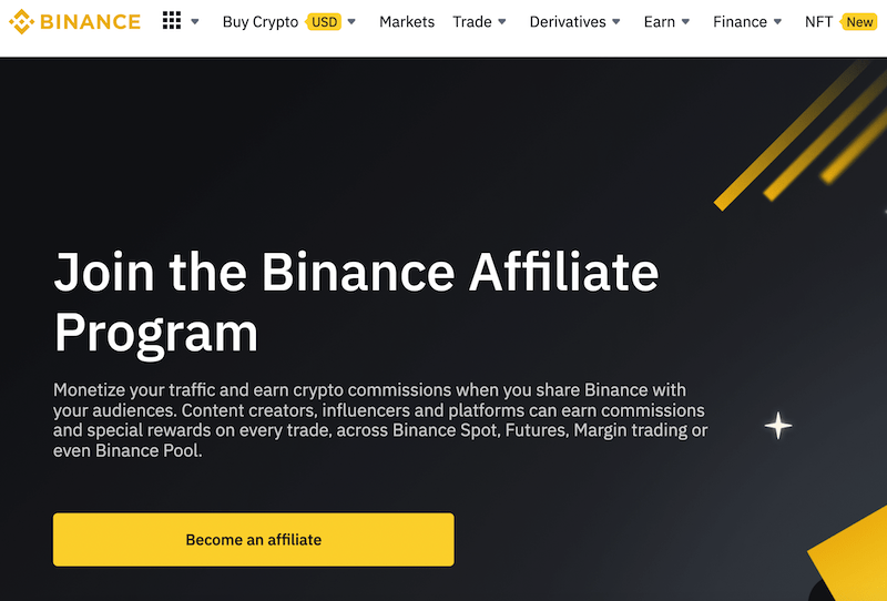 Binance es otra opción muy popular para los afiliados de NFT. Su plataforma le permite monetizar su tráfico y ganar comisiones criptográficas a través de su amplia plataforma de inversión.