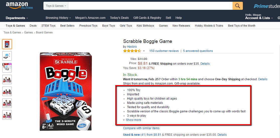 Del mismo modo, las viñetas ofrecen una oportunidad adicional para usar palabras clave y vender su producto. En el siguiente ejemplo, Hasbro usa palabras clave como "100% juguete" y "Hecho con materiales seguros" para hacer que su producto sea más atractivo para los consumidores.