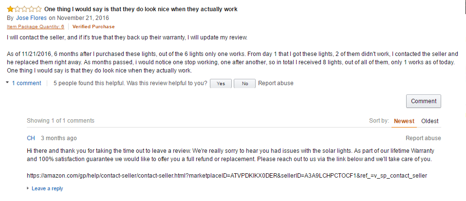 Como ejemplo, vea cómo el vendedor manejó esta crítica negativa de sus luces LED para jardín. El vendedor hizo bien con su mensaje al disculparse con el consumidor y pedirle que lo contactara a través de la plataforma de Amazon. Sin embargo, el vendedor podría haber sido mucho más rápido con su respuesta.