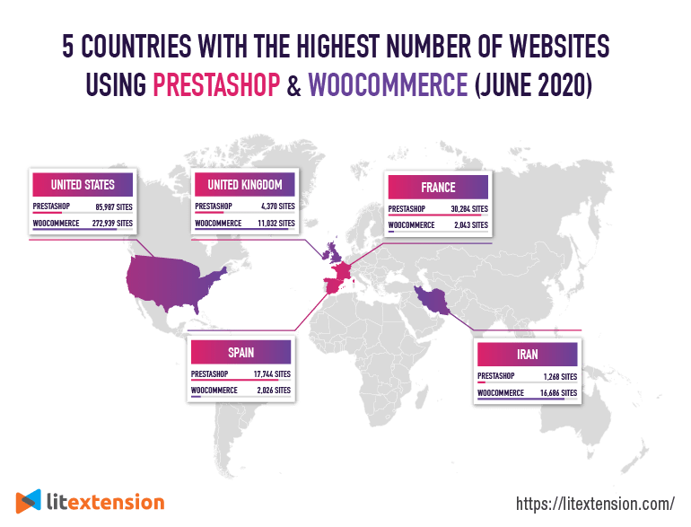 Además, en el aspecto geográfico, WooCommerce es líder en la mayoría de regiones como EE. UU., Reino Unido, Irán… mientras que los usuarios de PrestaShop son mayoritariamente de Francia y España.