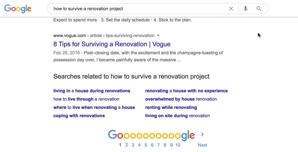 En este caso, comencé con "sobrevivir a una renovación" y obtuve esto: