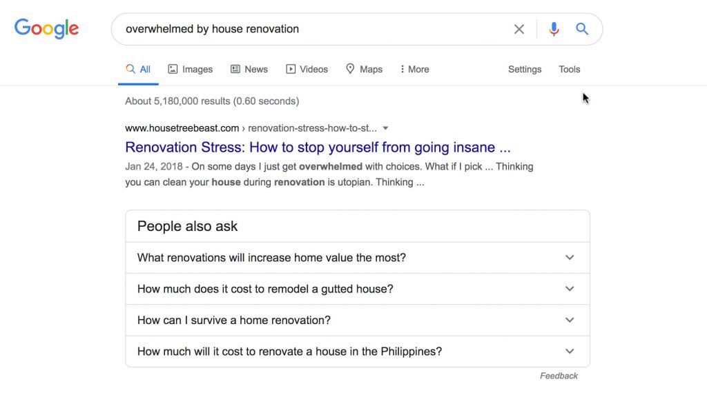 Aquí veo la frase "abrumado por la renovación de la casa". Todavía se siente demasiado general, así que lo uso como término de búsqueda y Google sugiere artículos sobre "estrés de renovación".