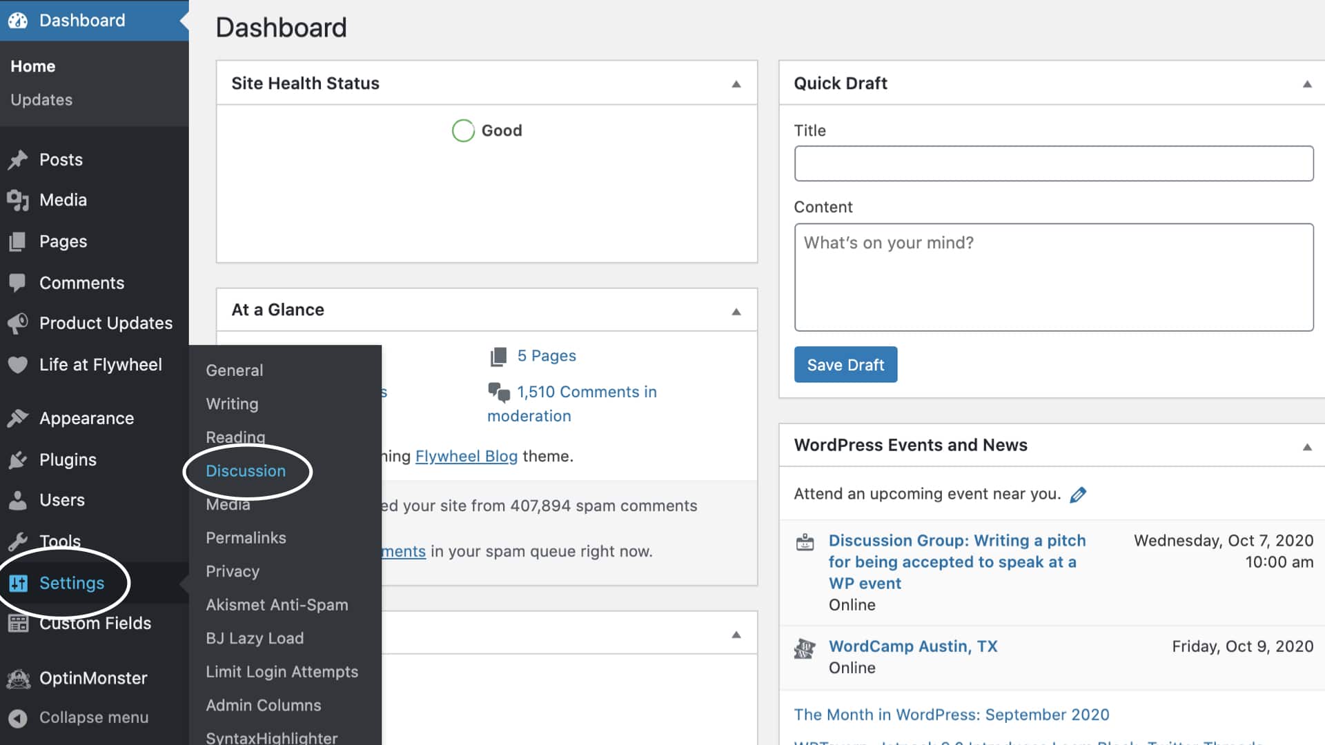 Conquiste proactivamente el spam de sus comentarios en la comodidad de su panel de administración de WordPress. Para llegar aquí, haga clic en Configuración > Discusión.