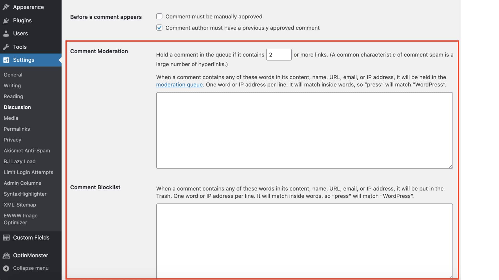 Recomiendo encarecidamente este siguiente consejo para detener los comentarios de spam: configure filtros y moderación de palabras clave. En las secciones Moderación de comentarios y Lista de bloqueo de comentarios, puede retener o bloquear automáticamente un comentario cuando contiene palabras desencadenantes que desea vigilar.