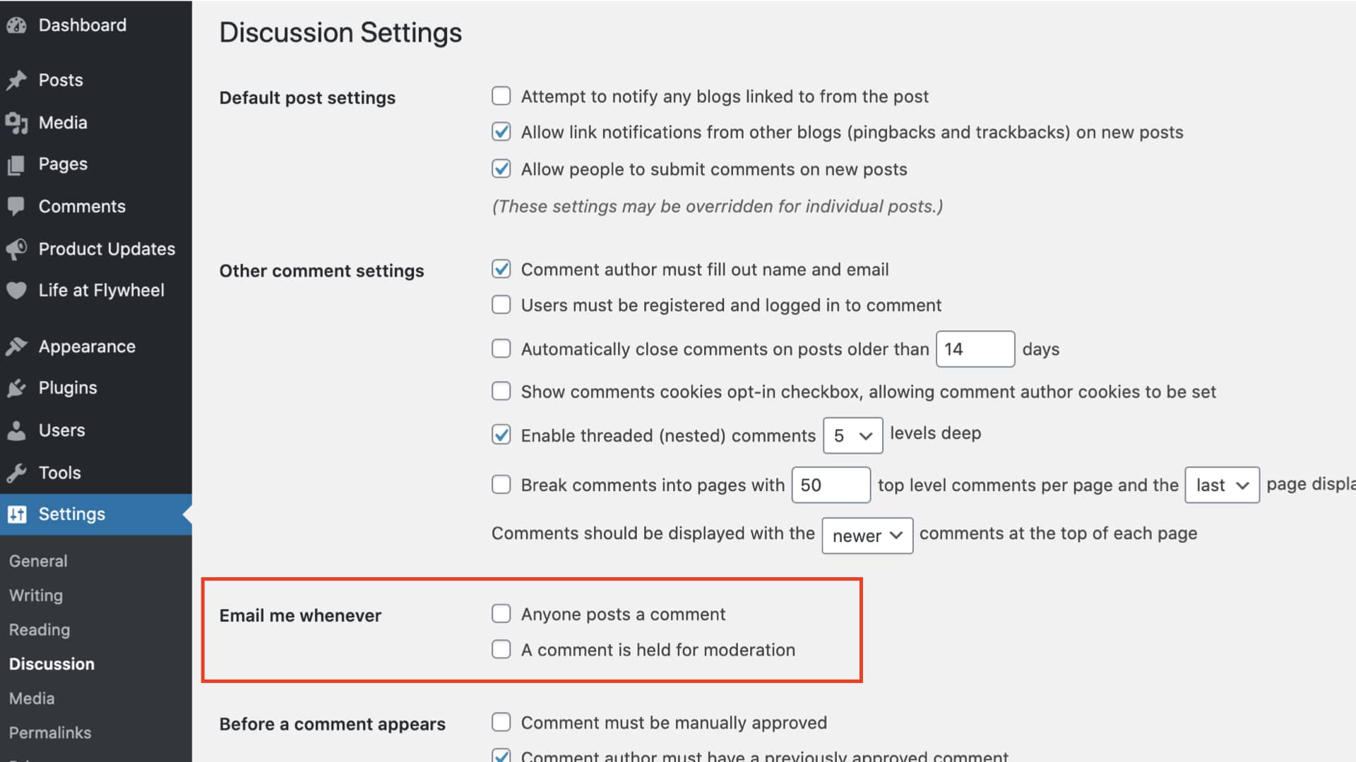 Configura tus ajustes para que te notifiquen directamente sobre comentarios sospechosos o de nuevos autores. En Enviarme un correo electrónico cuando sea, puede controlar cómo recibir notificaciones de WordPress para estos comentarios no aprobados. ¡Esto le da la oportunidad de encontrar los posibles comentarios de spam antes de que cualquiera de sus verdaderos usuarios de WordPress pueda ver o hacer clic en el spam!